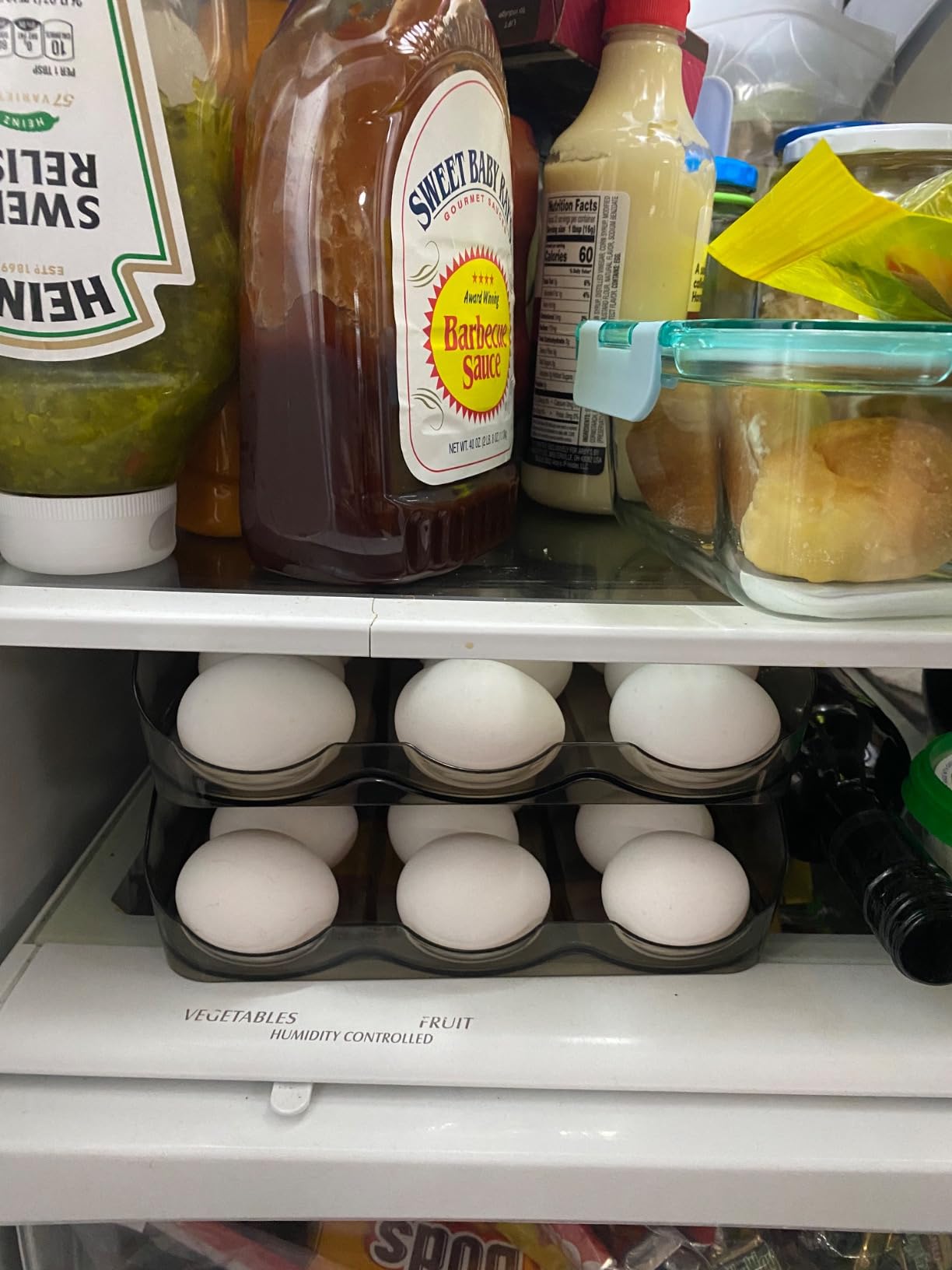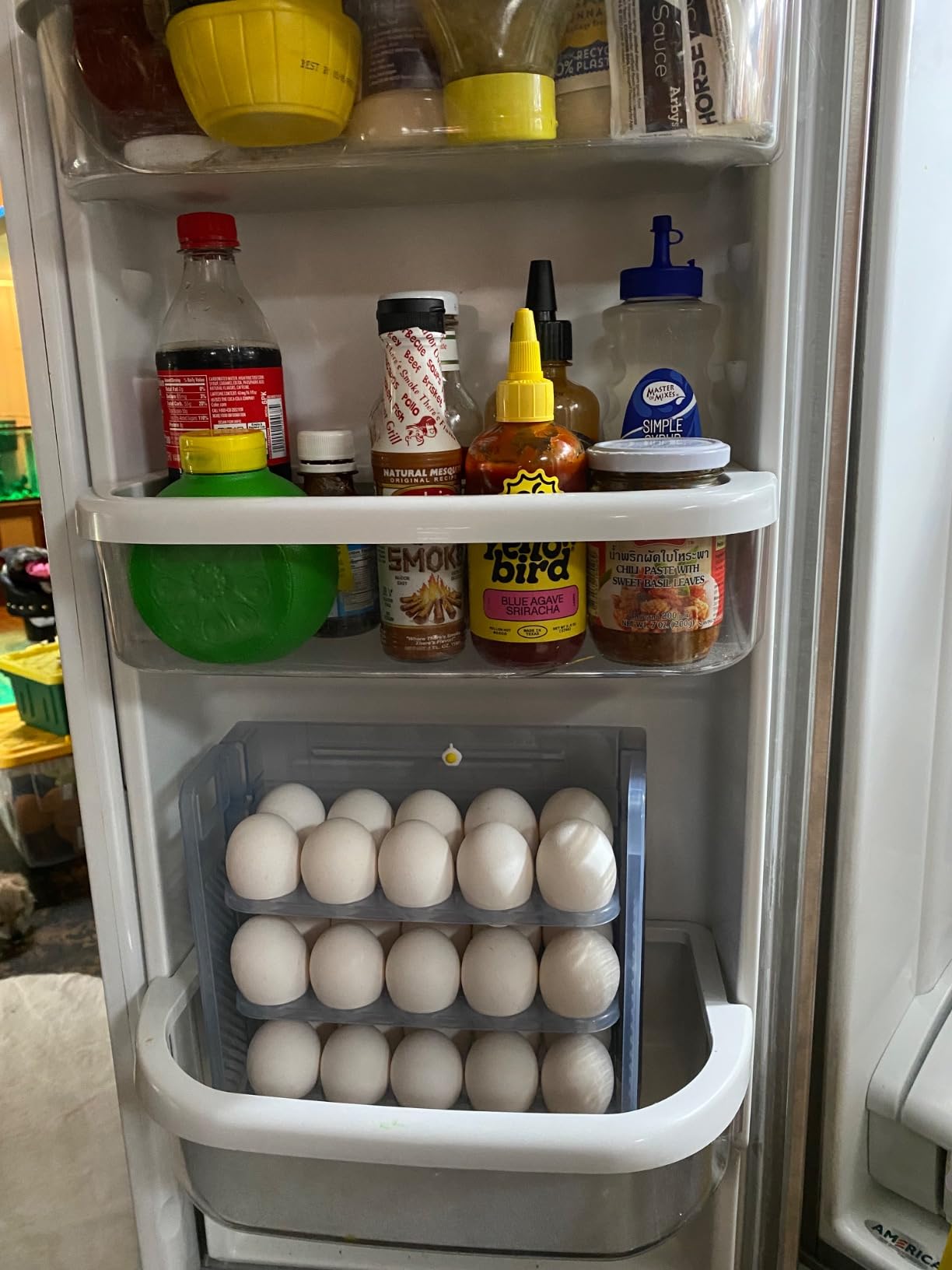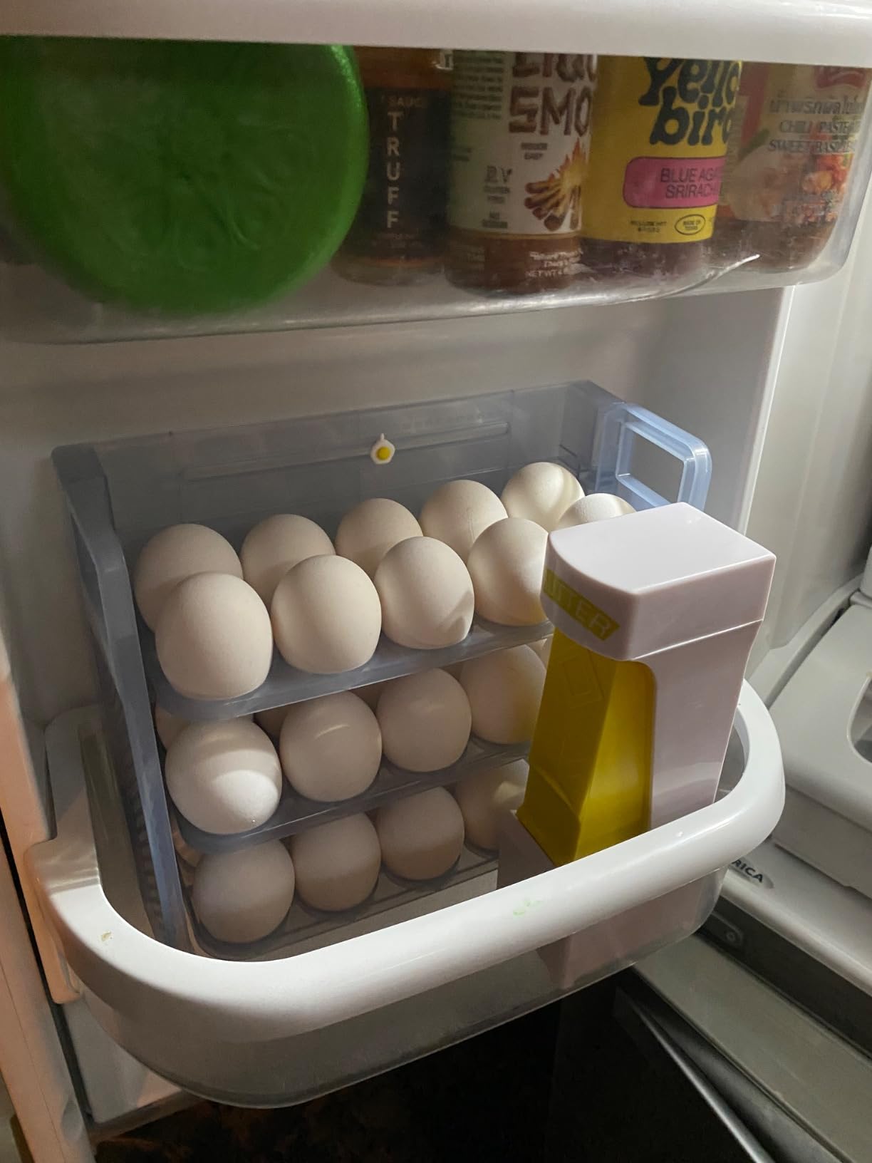 So I’ve had this really nice horizontal egg holder (2nd photo, I think?) for a while now. It holds 36 eggs and I love it, especially since my spare fridge is possessed by an evil deity that freezes fresh eggs for fun.🤬But then I saw THIS egg holder.I really liked that I could utilize a door shelf for eggs and literally free up 1/2 a shelf. I had to order it.It’s a great gadget, really. The shelves fold up, so as you exhaust eggs from the top level, you can fold the empty shelf up and easily access the next row of eggs. Genius!The eggs sit securely in their eggholes. I’ve only used large eggs in my holder so far, since I can’t afford XL eggs anymore. And even if I could they’re always sold out anyway.But I digress… back to my review.I have this thing called a Butter Cutter and it just so happens to fit perfectly in front of the vertical egg holder, allowing the fridge door to be opened & closed the way it always has. Without the Butter Cutter there is a gap between the egg holder and the edge of the door shelf allowing the egg holder to slide during opening/closing… I didn’t lose any eggs, but I definitely like the holder better when it’s not free-moving.It’s kind of a bummer that the manufacturer couldn’t design this holder to accommodate a quantity of eggs divisible by 12 (as they’re sold) but 2 days worth of breakfast takes care of the eggs that don’t fit. I don’t think that’s worth docking a star, because the space I just recouped by moving eggs to vertical storage pleases me immensely.This is probably the most exciting thing in my refrigerator right now, and I have some really good sauces, leftovers and even some caviar…. oh, and 30 large fresh eggs. Perfectly stored, vertically, in the door of my fridge. L🥚VE!
