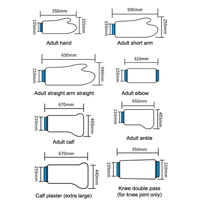 Type: Adult: Short Arm, Ankle, Hand, Calf, Straight Arm, Elbow, Knee.Children: Arms, thighs, ankles, long arms